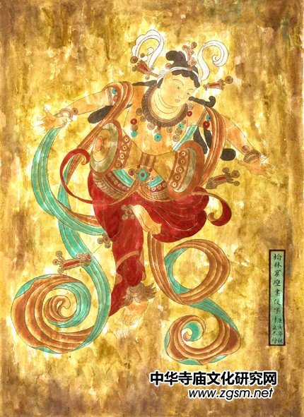 6.飛天宮女和樂舞伎。飛天是佛教八部眾天神之一。據(jù)佛經(jīng)上講,她們居住在風(fēng)光明媚的寶山中,專采百花香露,散天雨花,放百花香。每當(dāng)樂鼓齊鳴,天花紛飛的佛說法的莊嚴(yán)時刻,她們就出現(xiàn)在天空。飛天作為一種藝術(shù)形象出現(xiàn)在我國古代繪畫中,應(yīng)當(dāng)說是一種杰出的創(chuàng)造,她們的飛,不是靠身上長著的翅膀,而是僅靠她們身上幾條臨風(fēng)飛舞的彩帶,不論是平馳,斜趨、仰升還是俯降,都如同游魚戲水,飛鳥當(dāng)空,顯得那樣自在,輕盈而又美妙。敦煌壁畫是飛天最集中的地方。在莫高窟492洞窟中有三百七十多個洞窟繪有飛天,共計四千五百余身。這些飛天大都畫在洞窟中較高的壁面,她們配合整窟壁畫起著裝飾的作用,同時也豐富了“天衣飛揚(yáng),滿壁風(fēng)動”的意境。敦煌第321窟和第320窟上的飛天就是整個敦煌壁畫中飛天形象最完美的代表。飛天在國外已經(jīng)成為敦煌壁畫的代名詞。