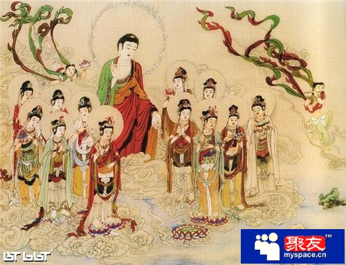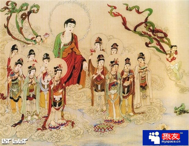 1.阿彌陀佛與諸圣眾接引往生極樂世界。人一生最重要的,莫過于能于今生求生凈土,了脫生死,永脫輪回之苦。而西方極樂世界就是最為殊勝的凈地,是阿彌陀佛以無比愿力所成就的,目的就是要幫助一切眾生離苦得樂。只要肯信、能愿、能行,老實念佛,具足「信、愿、行」三資糧,依教奉行,一生奉持不變,于臨命終時,必蒙佛菩薩來接引。圖中所示:「念佛臨終見寶臺,寶幡寶蓋滿空排,彌陀勢至觀音等,合掌相隨歸去來。」的圓滿成就。