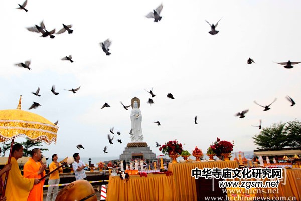 祈福萬事興,南海拜觀音。2011年4月18日(農(nóng)歷三月十六),為紀(jì)念108米三亞南山海上觀音圣像開光六周年,三亞南山寺全體僧眾按照佛教儀軌舉行祈福法會,共唱佛贊,并放飛和平鴿,祈福世界和平、社會和諧、人民安樂。