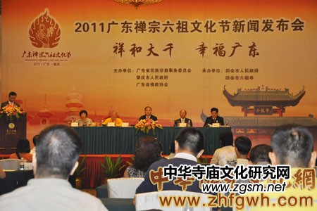2011年9月18日下午,“祥和大千 幸福廣東”2011廣東禪宗六祖文化節(jié)新聞發(fā)布會在廣州東方賓館召開。由廣東省民族宗教委員會、肇慶市人民政府和廣東省佛教協(xié)會主辦,四會市人民政府、六祖寺承辦的“2011廣東禪宗六祖文化節(jié)”將于10月26日至28日在肇慶市四會六祖寺舉行。廣東省民族宗教委員會副主任溫衛(wèi)平,肇慶市委常委、四會市委書記、市人大主任梁志強(qiáng),市政協(xié)副主席、統(tǒng)戰(zhàn)部部長謝錦文,中國佛教協(xié)會副會長、廣東省佛教協(xié)會會長明生法師等領(lǐng)導(dǎo)和嘉賓出席了新聞發(fā)布會。