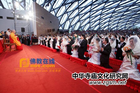 這場蝶舞良緣的佛化婚禮,在天公作美的涼爽氣候下,108對新人由16對花童引領進場,緩步前進的優(yōu)美隊形為婚禮拉開序幕。接著新人們一同于佛前許諾終生,希望互敬互愛白頭偕老,讓婚姻吉祥圓滿。在這場清新簡約的婚禮中,眾新人以四種環(huán)保的行動,從選擇不鋪張、不浪費資源的生活環(huán)保,與愛護環(huán)境、感恩大地的自然環(huán)保,還有簡化傳統(tǒng)婚禮繁雜的禮儀環(huán)保,以及凈化身心和環(huán)境的心靈環(huán)保,充分展現(xiàn)佛法的智慧和慈悲。