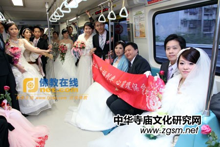 為響應節(jié)能減碳,永續(xù)綠色環(huán)境,法鼓山更廣邀新人偕同親友們一同搭乘捷運禮車至婚禮會場。元旦當天清晨一早,新人們便穿好禮服在捷運站亮相,他們和親友們相約在北投捷運站一同搭乘捷運禮車,抵達圓山站后再轉搭幸福巴士至舞蝶館,為減少交通運輸排碳量盡一份心力。