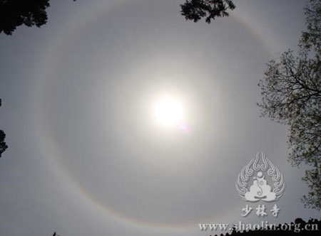 在浴佛節(jié)大法會進行時,天上忽現(xiàn)一道弧形光線,狀若彩虹。隨后,太陽被光圈環(huán)繞,龍?zhí)鞖g喜,一片祥瑞之相,實乃佛力加被、澤被蒼生之福瑞也!