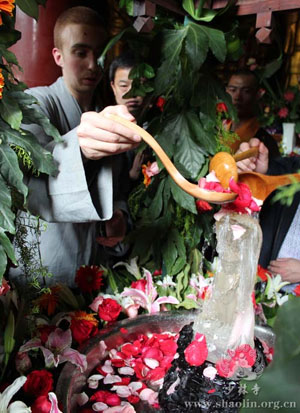 上午九時,龍?zhí)熳o佑,壇場莊嚴。少林寺常住院大雄寶殿內(nèi),香花燈燭,梵唄繚繞。香花叢中放置銅盆,盆中香湯由旃檀、紫檀、郁金、龍腦、沉香、麝香、丁香等配制而成。湯中立著一尊水晶釋迦太子像,法相莊嚴。永信大和尚拈香禮佛后,與全寺僧眾及眾位善男信女一起贊佛誦經(jīng)、祝圣繞佛、唱浴佛偈。隨后,僧眾和信眾們依次拿小勺舀湯浴佛,然后以香湯點浴自己,表示洗滌塵垢、蕩滌煩心,使得身心清凈,獲得無上功德。