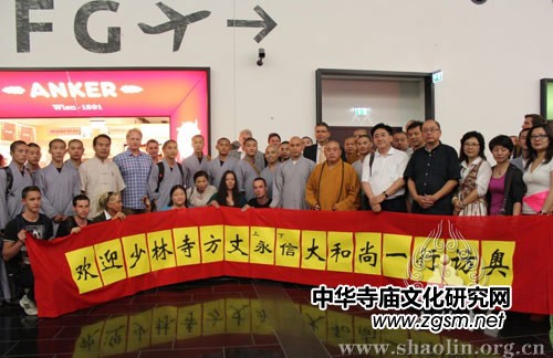 少林文化代表團抵達奧地利首都維也納,在機場出口受到了奧地利少林文化中心及當?shù)厝A人團體、信眾們的熱烈歡迎