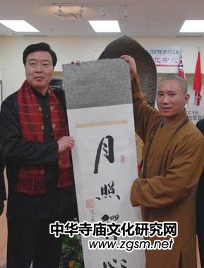 中國駐多倫多總領(lǐng)事房利出席了開幕式,贊賞之余他親自扶正了佛雕像前的吉祥八寶,般若講堂住持照續(xù)法師代表寒山寺贈送了秋爽大和尚的親筆書法“月照禪心”給總領(lǐng)事。湛山精舍九十歲高齡的開山宗長性空長老與現(xiàn)任住持達(dá)義法師等為展會內(nèi)的佛像開光,會場佛光普照,梵音繞梁。