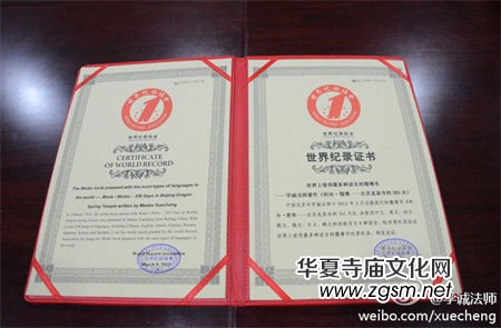 2013年3月20日,北京龍泉寺翻譯中心收到世界記錄協(xié)會寄來的“世界記錄證書”。