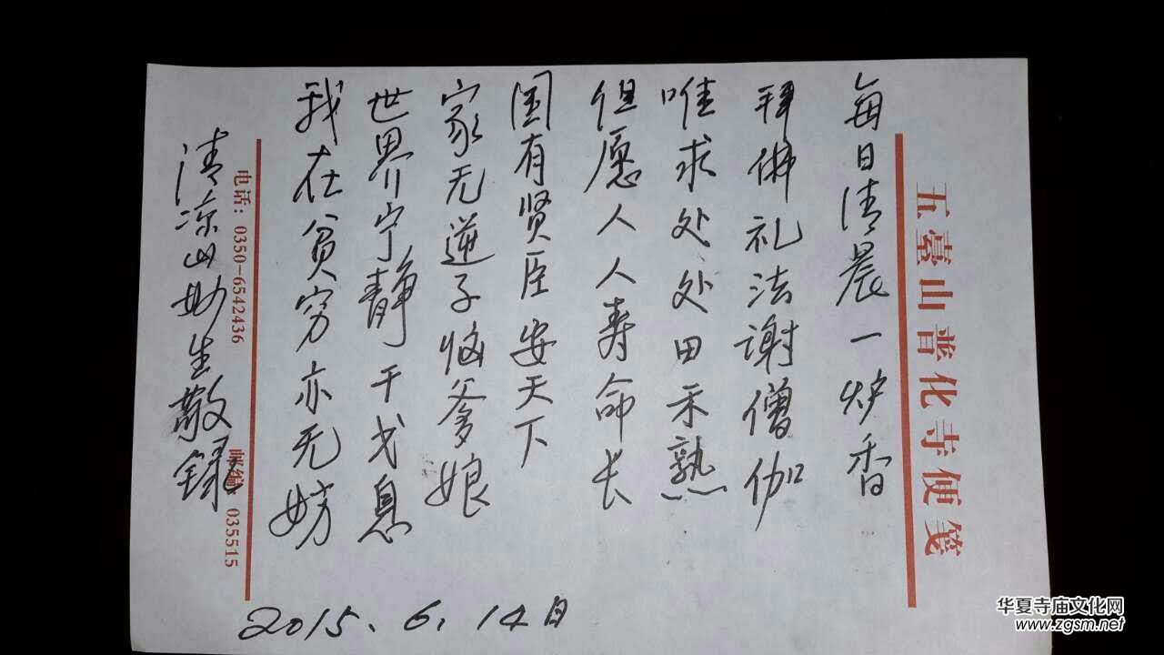 華夏寺廟文化網(wǎng)訊 2015年6月14日晚8時,五臺山靈峰寺舉行了2015年6月14日仰天大佛現(xiàn)世19周年供燈祈福法會,普濟寺、靈峰寺住持妙生大和尚主法,本會會長靳新國、副監(jiān)事長王建、副秘書長李月、林臏參加了供燈祈福法會。法會完畢后妙生大和尚為到場的居士開示了一首禪詩,并寫了下來。