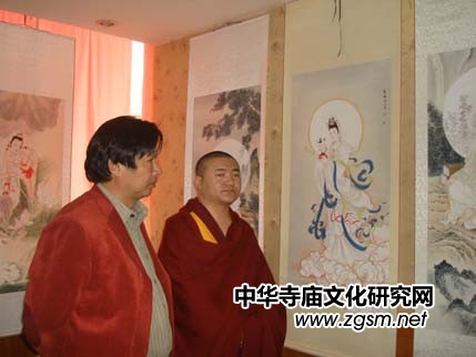 吳景晨和安嘉斯活佛在觀看佛光普照景晨書(shū)畫(huà)展