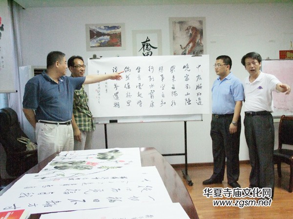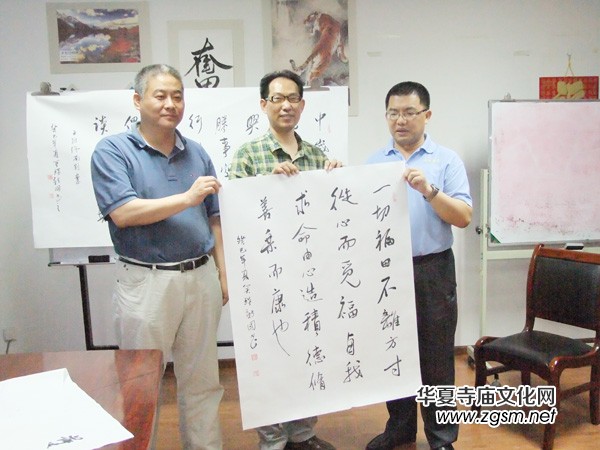 靳新國主編用素纖書畫帛書寫了三幅作品,落筆順暢,字體清新。圖為靳主編和董事長宋衛(wèi)民等合影。