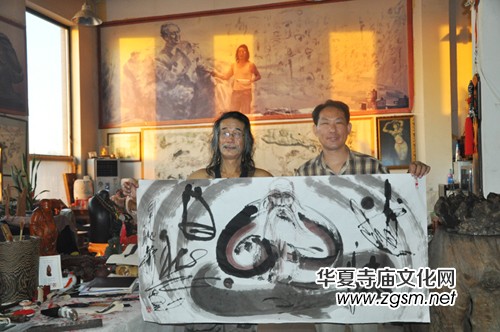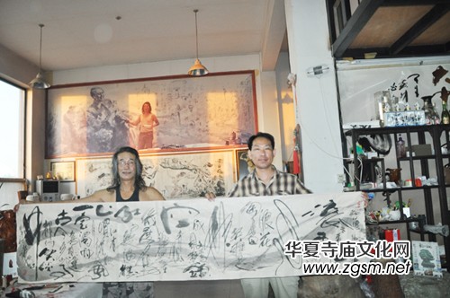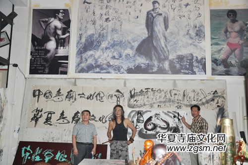 本網(wǎng)訊 8月25日下午,中國(guó)寺廟文化促進(jìn)會(huì)會(huì)長(zhǎng),華夏寺廟文化網(wǎng)總編靳新國(guó)(笑琰)、副會(huì)長(zhǎng)、《作家報(bào)》總編張富英、副會(huì)長(zhǎng)、著名詩我沉沙等一行來到宋莊蕭寬先生工作室,為蕭寬先生送去了刊登有蕭寬先生書畫的《科技信息報(bào)·今日文教》周刊,蕭寬先生很是滿意,談到中國(guó)寺廟文化促進(jìn)會(huì)和華夏寺廟文化網(wǎng),蕭寬先生即興題寫了會(huì)名和網(wǎng)名,并現(xiàn)場(chǎng)創(chuàng)作了一幅大寫意“老子悟道圖”,和創(chuàng)作了一幅他極具個(gè)性風(fēng)格的書法。蕭寬先生為人豪情,在書畫界有著極高的名望,德藝雙修,多年來堅(jiān)持自我個(gè)性創(chuàng)作,返樸歸真,追求大道至簡(jiǎn)。靳會(huì)長(zhǎng)贊譽(yù)道:“觀蕭先生,境界不同凡響,已是真人也!