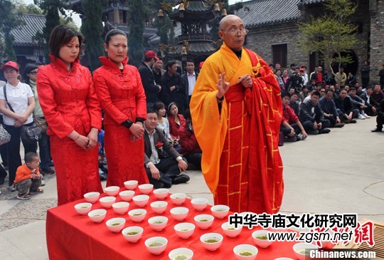 2011年4月16日,千年古剎妙高寺舉行“千人禪茶 心靈解壓”禪文化活動,讓民眾靜心品著毛尖茶慢慢化去心中的壓力。(王中舉 攝)